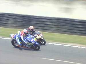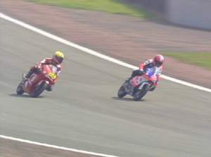 一個連續彎道上抓到機會,再次超越加藤,此時距離比賽結束只剩下4、5圈的賽程,加藤雖然在速度上絲毫不遜於原田的APRILIA戰馬;不過,在直線加速與彎道速度兩方面都未佔有優勢的清況之下,加藤想要把位置搶回也不是一件容易的事。終於在最後一圈時,