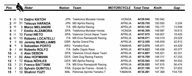 第14圈時將原田超越,搶回領先位置。Melandri在整場比賽中一路守在第3的位置,由於身上負傷,因此也無意push自己的步調加入加藤與原田的戰局之中。不過,後面4、5、6位這個集團的幾位車手F.Nieto、