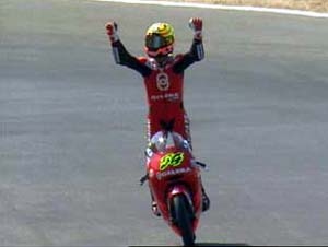 開始發動攻擊,先超越掉第二位的原田哲也,接著又在下一圈利用直線路段將M.Melandri超越,取得領先。
