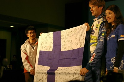 ![]() ▲車迷獻上簽名祝福的芬蘭國旗Marcus表示他覺得今天所駕駛的這台國產TDCi與他在歐洲所駕駛的感覺沒有太大的差異。他認為Focus是一台相當不錯的車款,在底盤與操控的水準都相當高。在過兩站後Marcus Grönholm將正式從WRC場上退休,記者問到Marcus退休的計畫時,他笑笑的表示目前只想到如何在剩餘的兩場比賽中獲勝,對於退休後的生活還沒有一個確切的計畫,不過他會先好好的陪陪他的家人。