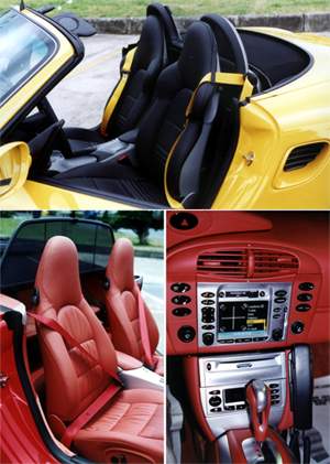 黃色Boxster S搭配GT3 鋁圈![]() ▲Carrera 4 Cabriolet的紅色內裝搭配鋁合金飾板造型相當炫麗,中間的液晶螢幕也充滿科技感受另外一部黃色的Boxster不若前者誇張,在外觀上僅選配了911 GT3的18吋同色Sport Design II三片式鋁圈,並加選了跑車化的懸吊套件,而內裝也僅增加了黃色安全帶與不鏽鋼的車門飾板,即便如此,鮮黃的車體依舊可以在開上路時吸引眾人的眼光,這種較「低廉」的花費,的確值得稱連lash;!