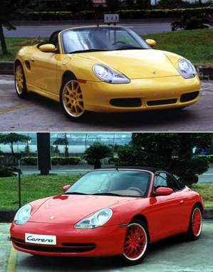 紅色真皮內裝與銀質鋁合金飾板的絕妙組合![]() ▲兩部車都選擇了18吋同色鋁圈,且俱為18吋設定。本次特訂車的兩位主角是一部紅色的Carrera 4 Cabriolet與黃色的Boxster S,永業的新聞稿上還特別註明那部紅色的Carrera 4的車主曾擁有過超過五輛的保時捷跑車,這輛最新的上空寶貝是要贈與夫人的,而夫人又特別喜歡紅色,因此這位先生為了夫人的愛好,甘願付出比普通的Cabriolet多出兩百餘萬的價格訂購Exclsive的特製外觀與內裝,如果愛情可以用金錢衡量,那麼想必這位仁兄對夫人的愛絕對是超重量級的,不過如果男性網友看到這一段的話,可千萬注意不要讓女友看到這則新聞,否則女友藉此質問,本網可不負責喔!