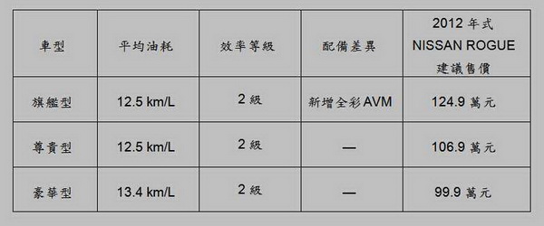 全新2012年式 NISSAN ROGUE正式進駐全國NISSAN展示間,同時提供70萬40期零利率優惠,全車系售價如下表:
