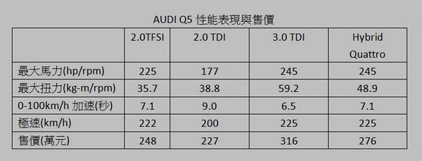 動力部分,這次新Q5也一舉從之前的2.0 TFSI、3.0 TDI一汽一柴二車型擴增至2.0 TFSI、2.0 TDI、3.0 TDI加上Hybrid油電車等四款車型。四車型皆為缸內直噴設計,並標配Start/Stop怠速自動熄火/啟動系統,不論在油耗或廢氣排放上都比之前更為降低。
