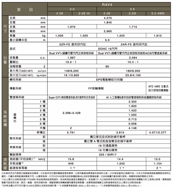![]() 在機械結構方面,本次2.0升使用代號3ZR的引擎,並搭配模擬七速的CVT變速系統,動力輸出為146ps/19.1kgm,平均油耗15.8km/L。2.5升車型則搭載代號2AR的引擎,配合6速手自排系統,動力輸出為180ps/23.8kgm,2WD和4WD車型的平均油耗分別為14.4km/L、13.0km/L。