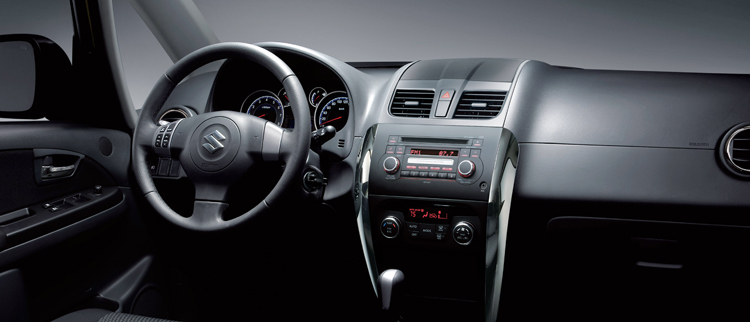 SUZUKI New SX4 內裝搭載整合式多功能行車資訊顯示幕,可同時將時間、室外溫度與油耗等資訊完整呈現,三幅式真皮方向盤則設有切換頻道的音響快撥鍵。中控台導入全新鍍鉻飾條造型設計,並配有AUX-IN整合式CD音響系統搭配八支環繞音場喇叭。此外,Keyless啟閉系統及電磁式尾門開關也提升SX4車便的利性。