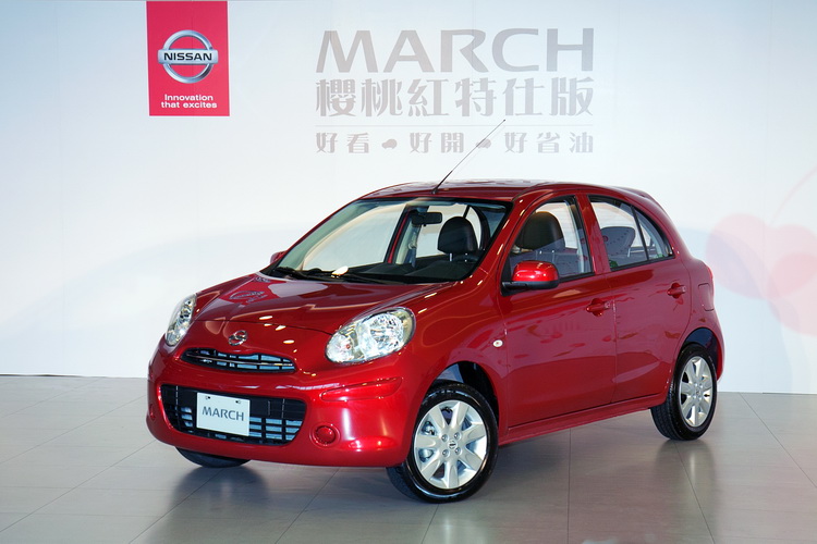 裕隆日產汽車為慶祝NISSAN March在臺熱銷超過14萬台,特別推出櫻桃紅限量特仕車,時尚摩登櫻桃紅車色搭配各種以櫻桃紅元素妝點的車室內裝,展現與眾不同的時尚活潑氣息,限量價新台幣49.8萬元起。
