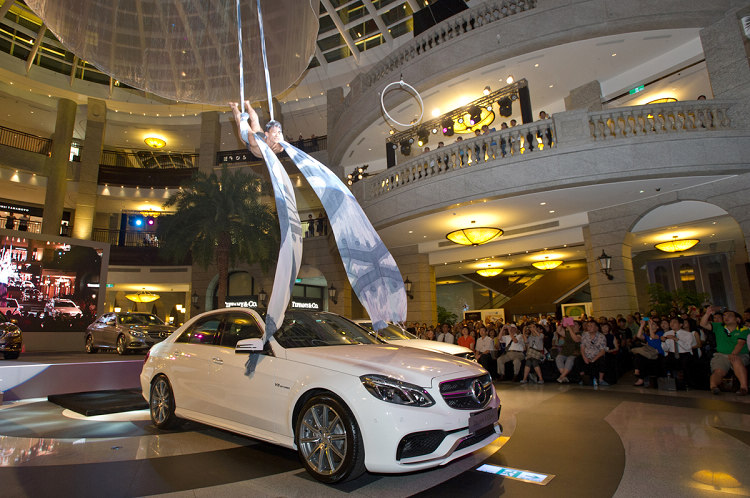 ▲被譽為「舞壇台灣之光」的太陽劇團首位台灣舞者張逸軍,徒手以其擅長的綢吊方式翩然降臨,為新車發表活動再掀高潮。