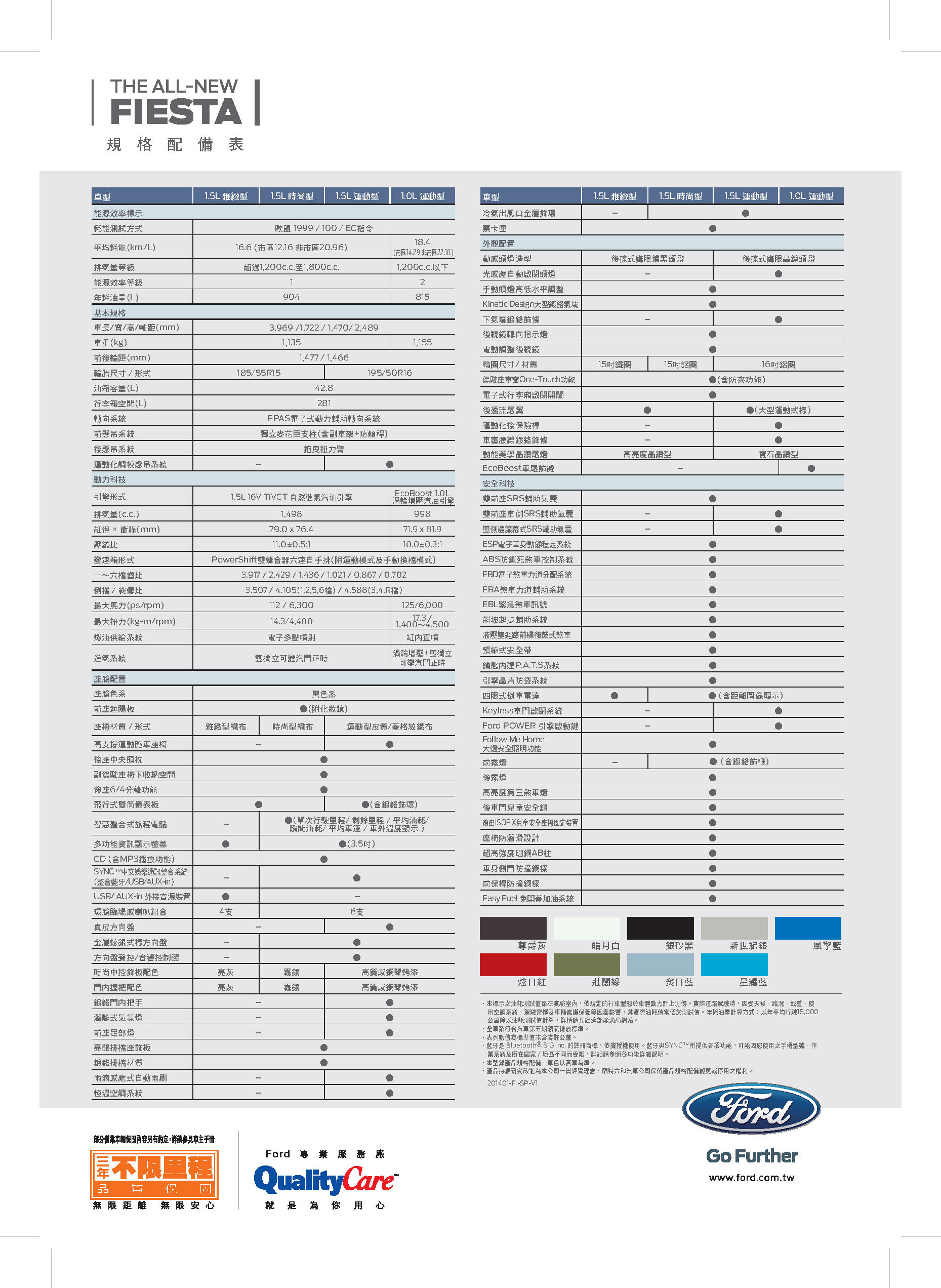 福特六和汽車2月26日在台北文創大樓發表小型掀背車FORD Fiesta小改款新車,不僅將1.0升EcoBoost三缸渦輪引擎導入國內,還身懷Keyless車門啟閉系統、SYNC中文娛樂整合通訊系統以及全車系標配ESP車身動態穩定系統等安全配備及車用科技。這次小改款上市共提供提供1.5升雅緻型、時尚型、運動型以及1.0升運動型,共四款車型編成。