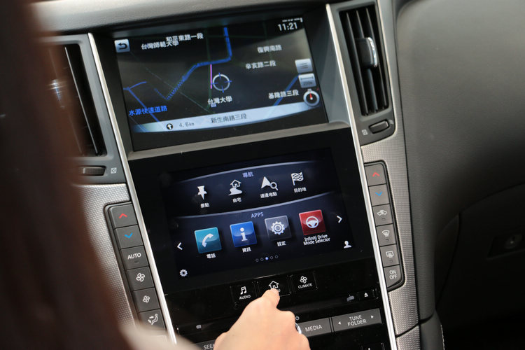 ![]() ▲Q50中控台中央配置雙觸控式螢幕的多媒體控制面板,整合了Q50一切的視聽裝置。Q50車頭配置Double Arch雙弓式水箱護罩,以及智慧型LED頭燈,具備主動轉向與自適型智慧光感應的先進科技。車頭前保桿兩側並搭配F1方程式定風翼,以源自F1的設計理念,大膽宣告Q50的競速血統,將競賽場上的速度記憶與駕馭快感,原封不動地帶進城市街道。