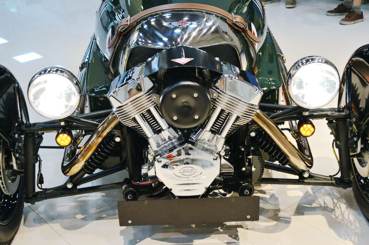![]() 至於全新3 Wheeler動力搭載S&S Cycle Inc.專為MORGAN特製的1990cc引擎,也是車頭最明顯的特徵;S&S曾是美國Harley-Davison機車著名的改裝品牌,不過後來也開始設計製造引擎,而用在這款車上的V型雙缸自然進氣引擎不是傳統的45度,則是採用56度夾角設計,這是為了容納更大的活塞。氣門機構為每缸2氣門、3凸輪軸透過推桿來控制,也就是兩缸共用中央凸輪軸推動進氣閥門,排氣閥門則由另外兩支凸輪軸負責。 ![]() ▲前懸吊採用雙A臂懸吊設計,後輪則加上減震筒與彈簧的結構。