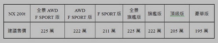 LEXUS今年八月在國內發表全新運動休旅產品NX,當時先以搭載混合動力系統的300h之單一動力選項來進入國內。不過面對不少消費者對於渦輪引擎車型的詢問,總代理和泰汽車也順應需求宣布搭載單渦輪雙渦流引擎與D-4S缸內燃油多重噴射系統的NX 200t開始上市。