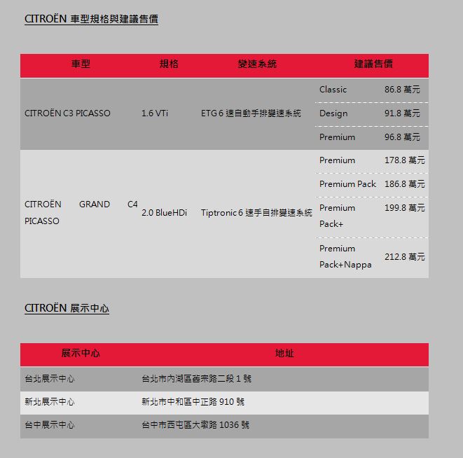 經過一年縝密計畫及積極佈建,寶嘉聯合於2014年12月17日晚間發表CITROËN品牌正式登場,同時公布CITROËN首波上市車款,包含曾於2014台北車展亮相之豪華法式科技旗艦MPV – CITROËN GRAND C4 PICASSO,也將引進實用高機能、創意多變MPV – CITROËN C3 PICASSO,多元化車款選擇滿足消費者不同用車需求。