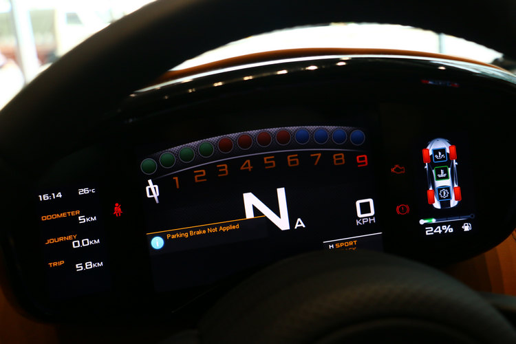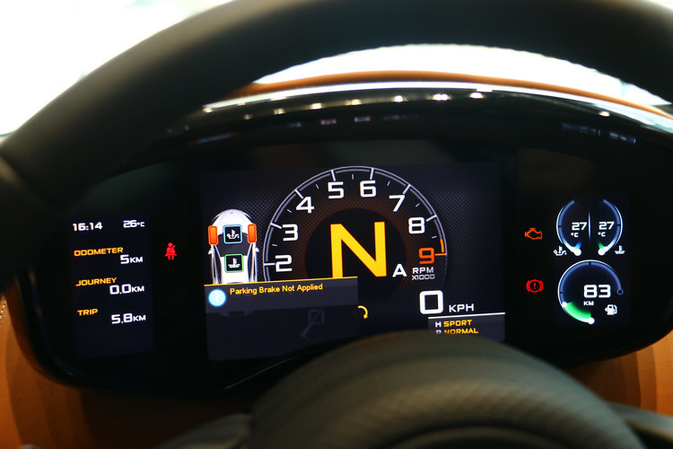 ![]() ▲儀錶台遮陽板造型特殊,中央的高音喇叭也和650S偏於傳統的揚聲器造型完全不同,而以極具設計感的造型現身。空氣力學一直是McLAREN超跑的重點,570S在輕量化的設計原則下,同時提升車身下壓力;車底風流經平整底盤滑切,連結競技取向的後擾流設計使空氣往後拋竄更為順暢。 ![]() ▲標配車型的車側面板為黑色塗裝,不過業者展出的展示車配上碳纖維飾板。![]() ▲全數位化液晶螢幕的色彩與功能性相當絢麗,不同模式下還會有完全不同的 佈局。![]() ▲標準駕駛模式下,中央轉速表會以圓盤式呈現。