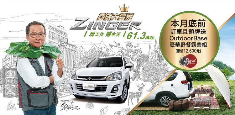 三月底前訂車且領牌送豪華野餐露營組 想成為人生大贏家,就開Zinger商旅大贏家,Zinger以更具魅力、更親民的價格推出,車型售價分別是雅緻型61.3萬、標緻型62.9萬、精緻型65.9萬、豪華型70.9萬、旗艦型73.9萬。本月底前訂車且領牌就送OutdoorBase豪華野餐露營組(市價12,600元),還有響應政府舊換新補助5萬、低月付5千元起等好康。詳情請洽MITSUBISHI各展示中心或上官網http://www.mitsubishi-motors.com.tw/查詢。