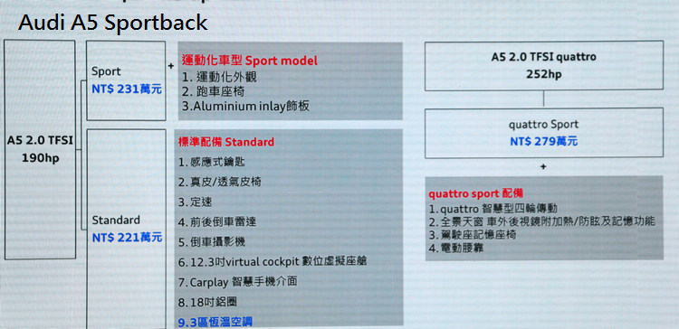 ![]() ▲更加寬大且低趴的身形,將強烈的跑格展露無遺。全新A5採用智慧型複合材質輕量化車體結構技術,針對車身、引擎、內裝和底盤進行全方位的輕量化工程,與前一代車型相較下全新 A5 Sportback足足減輕85kg,A5 Coupe減輕幅度亦達到60kg。至於quattro智慧型四輪傳動技術,在A5 45 TFSI quattro於一般的行駛狀況下可提供前軸40%:後軸60%的非對稱動力分配比例,並根據不同之路況變化可在最短時間內自動將動力分配至前/後軸,其前/後軸最高可調整分配比例至70%及85%,而quattro系統採機械結構設計的後輪差速器,更可有效改善行進間的牽引力和動態操控表現,保有最佳循跡穩定性。 ![]() ▲A5 Sportback與Coupe車型在標準乘坐模式的行李空間分別為480公升、465公升,兩者後座椅背皆採用40 / 20 / 40獨立分離傾倒設計,若Sportback車型將後排座椅調整為全傾倒模式,行李箱空間可擴充為1300公升。
