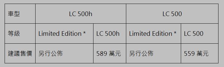 共4個等級,Limited Edition將於2017年10月起生產全新LC 500h及500將分別提供兩個等級供顧客選擇,配置較為運動化的LC 500h及LC 500標準車型,建議售價分別為589萬元及559萬元。Limited Edition除了配備上與標準車型些許不同,最大的差異是極具魅力的外觀內裝車色組合。專屬於Limited Edition,啟發自南美大藍閃蝶、以結構性塗料科技打造的風馳藍車色,僅會反射出光譜中的藍色,在路上擁有非常高的吸睛度。