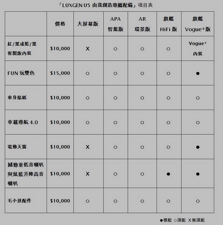 ![]() 這次推出的U5專屬配備,超過千種的不同搭配,消費者可自由選擇「FUN玩雙色」,更可依照喜好搭配「紅/黑」、「藍/黑」客製版內裝配色、獨特造型「車身貼紙」、酷炫「撼動重低音喇叭與炫藍升降高音喇叭」、電動天窗、原廠「車載導航4.0」等(詳情請見附表),打造U5專屬運動風格與舒適的駕馭空間。另外,針對AR環景版或旗艦HiFi版也推出雙色客製車(烈焰/風暴版),消費者可以25,000元擁有總價值高達45,000元的「紅/黑」或「藍/黑」客製版內裝配色、「FUN玩雙色」、獨特造型「車身貼紙」與原廠「車載導航4.0」!