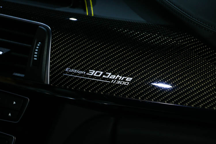 而與車身烤漆相對應的Merino真皮內裝配色及碳纖維飾板則如同畫龍點睛般,使全新BMW M4敞篷跑車30週年紀念版內外兼修,散發濃烈賽車氛圍。為向經典致敬,除了車門檻與座椅頭枕上皆刻有「30 Jahre Edition」專屬字樣之外,位於副駕駛座正前方的內裝飾板上更深深烙印「30 Jahre Edition」及「1/300」之專屬印記,彰顯全球僅限量300台的不凡身份。
