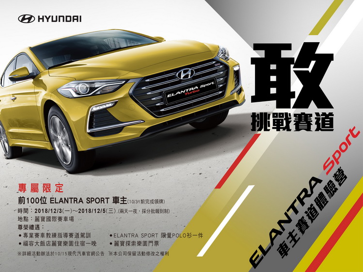 全新HYUNDAI ELANTRA Sport即將於10月15日飆速上市,即日起(10/1)預購入門ELANTRA Sport 84.9萬元,極速款92.9萬元於全台HYUNDAI展示中心開始預訂。全新ELANTRA Sport前100位車主,免費獲邀參加「敢。挑戰賽道 ELANTRA Sport車主賽道體驗營」活動名額,由專業賽車教練帶領車主直衝即將登場麗寶G2國際賽道體驗,還可獲頒專屬證書、紀念Polo衫、麗寶福容大飯店精緻住宿與探索樂園入場門票等,總價值高達5萬元超值好禮,HYUNDAI現代汽車就要讓您衝賽道、玩樂園、住麗寶。