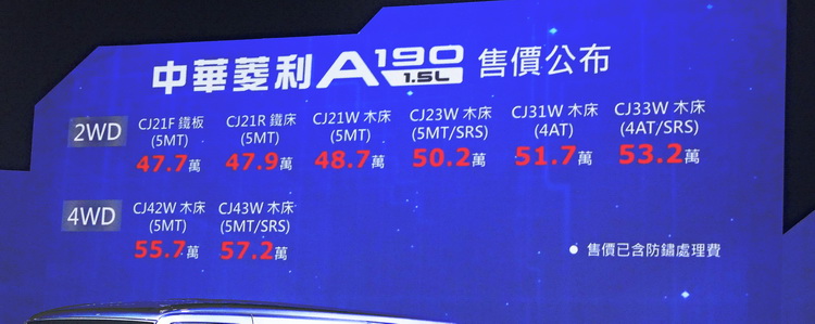 綜合扭力大,起步、加速、載重更加輕鬆的商用需求,中華菱利A180、A190全新升級三菱技術1.5L可變汽門正時引擎,另有4速自排可供選擇,讓駕駛更便利,此外擁有馬力97.9ps/5,500rpm及扭力13.7kg-m/4,500rpm的動力表現,馬力提升12%、扭力提升20%、2WD木床車型節能效率提升6%,以一級能源效率的展現行車經濟性,而全新儀表板及行車資訊顯示幕讓行車資訊一目了然,頭家輕鬆駕馭。