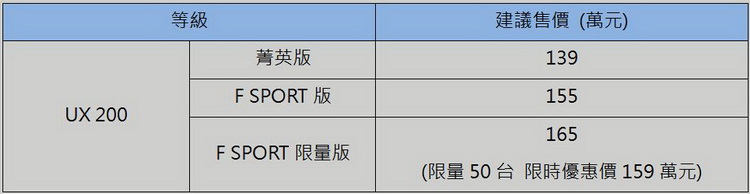 都會不可或缺的主被動安全 全車系標配新一代Lexus Safety System +主動式安全防護系統,包含都會實用的PCS預警式防護系統附行人偵測及自動煞車輔助。不管是面對車輛或行人,當PCS偵測到有碰撞的可能時,便會警告駕駛並預先為煞車加壓,若駕駛未採取反應,車輛則會自動煞車以避免或降低碰撞的可能性或造成的傷害,DRCC雷達感應式車距維持定速系統起始作動時速亦降至30km/h,提升都會行車便利性。同時,UX配備8具SRS氣囊等多樣被動安全配備,全時守護行車安全。 F SPORT版樂趣更多 UX 200車型中也提供F SPORT版,不但外觀與內裝設計更為運動化,專屬調校的電子懸吊避震系統讓UX的駕馭樂趣更上一層。專屬的網格狀水箱護罩及燻黑霧燈罩、18吋專屬鋁圈及後保桿的燻黑鍍鉻飾條襯托UX與生俱來的運動性,車室內,UX 200 F SPORT版搭載專屬的方向盤及換檔撥片、排檔桿頭、鋁合金踏板及源自於F車系,加強包覆性的專屬座椅。底盤部分標配可650段自動調整的AVS可變阻尼避震系統,搭配位於後軸的主動式車身抑震系統及5種不同智能駕馭模式,駕駛可依照心情隨時切換。