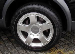 Quattro四驅與四段高度可調懸吊系統![]() ▲國內引進的Allroad搭配原廠列為選用的兩片式鋁合金輪圈,並且以鈦合金材質的螺絲固定。在Allroad上,AUDI使用了該廠引以為傲的Quattro全時四輪驅動系統,這套系統基本上是透過Torsen(扭力感應式)中央差速器來分配前後車軸間的扭力分佈,配合利用對個別車輪施以制動方式調整四輪扭力輸出的EDL電子防滑差速鎖定器,與先進的ESP車身動態穩定機構,來達到最佳的動力輸出分配。至於底盤系統方面,Allroad採用與A6 Avant旅行車相同的單體式車身結構,但配合越野車獨特的需求適度地將其輪距與車高增加,增設肋狀車體鈑件,並且加上粗獷造型的前後保桿與輪拱,及前後車底的不銹鋼護板與引擎室的FRP底板。