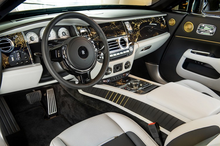 Wraith Eagle VIII的內裝飾板設計致敬了當時飛機飛越大西洋的歷史,採用了煙燻桉樹木飾板並以真空工法鑲嵌黃金、銀和銅,透過3D雷射雕刻技術費時10小時將圖案雕琢創造出夜空俯瞰地面燈火的樣貌。另一項設計巧思還有知名勞斯萊斯鑲嵌在中控台的時鐘,在飛越大西洋的當時,兩位飛行員在座艙內感受到冰凍般的氣溫,唯一可見的只有機上儀表發出的淡淡綠光。因此,Wraith Eagle VIII的設計師讓車室內時鐘於夜間產生出綠色光環,象徵此次飛行挑戰的極端環境。並且在時鐘面上印有當時著陸點的經緯度字樣,表面的圖樣和指針設計則是效仿羅盤的樣貌。