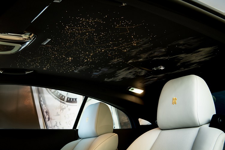 勞斯萊斯的內裝設計當中最精采的莫過於獨特的星光頂篷。在Wraith Eagle VIII的星光頂篷上面設計團隊複製了1919年6月15日當時的星象位置,以1,183個星點及精緻的雲層刺繡重現當時大西洋上的夜空,然後加上銅色虛線來表示飛行路徑,飛行路線上的紅點代表著兩位飛行員衝出濃霧開始仰賴星空導航的時刻。勞斯萊斯Bespoke客製化除了是產品細節的呈現,背後的故事傳遞與致敬也是勞斯萊斯客製化精神之一。