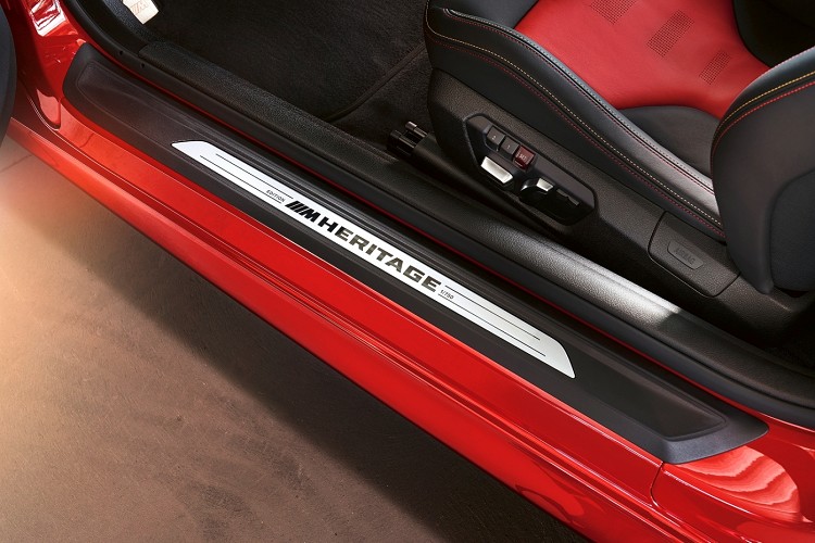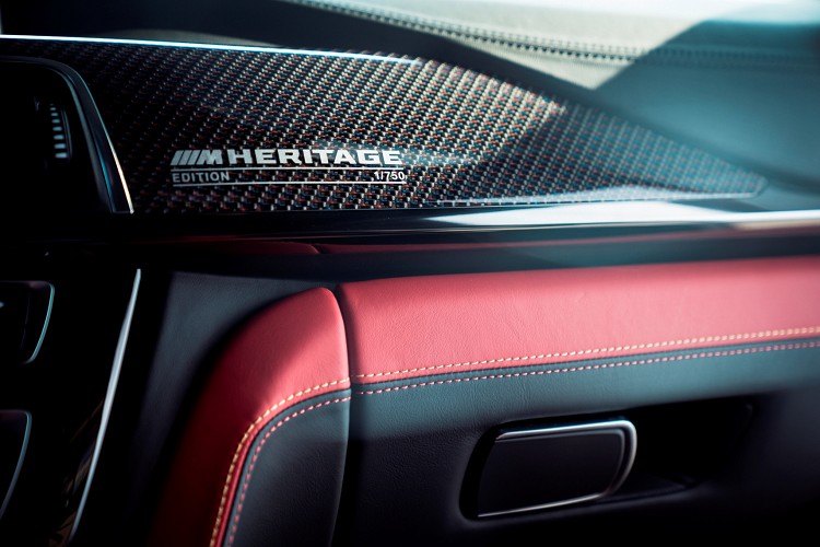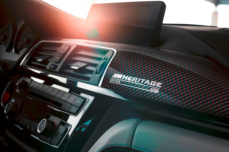 座椅頭枕繡上「Edition /// M Heritage」字樣以及迎賓踏板與碳纖維紀念飾板上的「Edition /// M Heritage」和「1/750」專屬印記,成為BMW M4 Edition ///M Heritage的獨具特色;其中為BMW M4 Edition ///M Heritage量身打造的專屬碳纖維紀念飾板,以M Logo三色交織而成,強韌輕量又與眾不同的設計語彙為前座駕駛與乘客更安全無虞且獨具一格的感官享受。