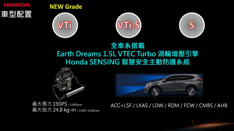 新CR-V標配Earth Dreams Technology技術群中的1.5L缸內直噴渦輪增壓引擎,可創造零遲滯、且超越同級的高效能動力,最大馬力輸出達193 PS及 24.8 kg-m的豐沛扭力。研發團隊同步提昇引擎進、排氣效率,及汽門系統的冷卻及燃燒效率提升等技術,加上優異的CVT無段變速箱傳動效率,車身輕量化工程,達成一級能源效率等級,並符合最新嚴格環保法規。極致進化動力與燃油效能的完美平衡,讓顧客同步享受高效動力帶來的自信駕馭、環保節能及稅金等優勢。