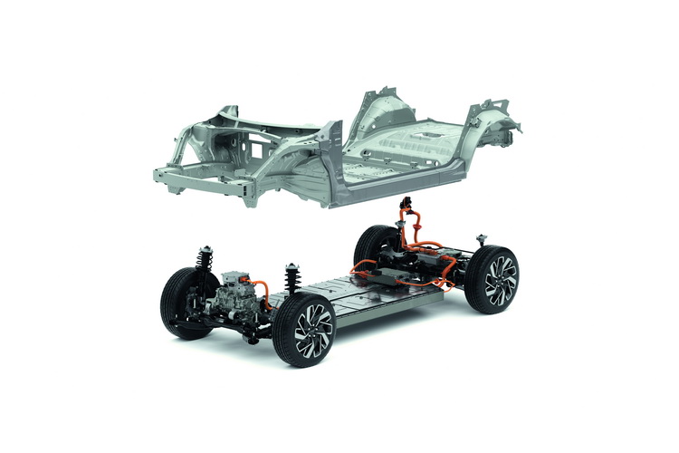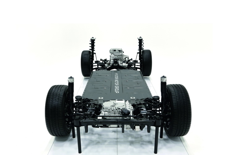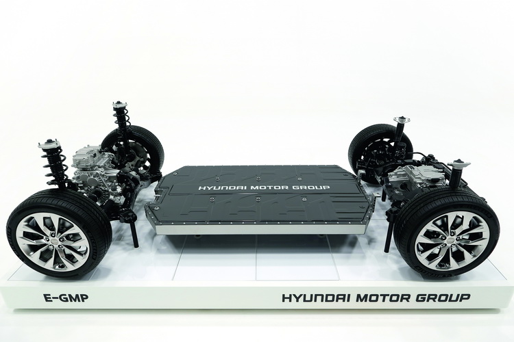 E-GMP底盤採用高轉速電動馬達來提升動力輸出、採用中型車常見的五連桿懸吊加上將車輪軸承與驅動軸相結合的整合式驅動軸,提升乘坐舒適性與操控穩定性。所搭載的電池能量密度比現行電動車電池提升約10%體積也更小。配置於車室下方的模組化電池組也可以配置不同數量的電池單體,提供不同的蓄電容量選擇。