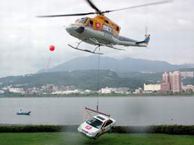 ▲為了替C5造勢,永業特別在發表會中安排了一段由直昇機懸吊過河的「表演」。