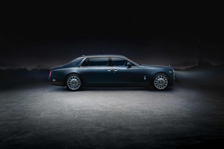 Phantom Tempus “天魄” 典藏版車身採用的勞斯萊斯全新Bespoke高級定制車色 “凱洛斯藍”( Kairos Blue)代表著太空的黑暗和神秘。不僅如此,車漆含有珠玉般的藍色雲母薄片,遇光則如同繁星一般閃閃發亮。這一視覺效果在黑色外飾細節襯托之下更為耀眼。