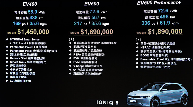 南陽實業在台發表Hyundai ioniq 5電動休旅車,同步引進EV400、EV500及EV500 Performance三款車型,預接單價分別是:145萬元、169萬元、189萬元,不過台灣今年只搶到120台的配額,預計3/19進駐全台展示間。業者並宣佈第四季正式回歸5噸國產大型商車市場,並自今年起連續三年,每年都將引進一款全新電動車款,因此ioniq 6和ioniq 7將於明年和後年陸續引進。