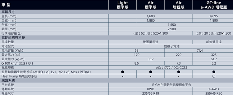 Kia EV6電動車正式在台展開預售,國內共推出四種車型,分別是:EV6 Light標準版(154.9萬)、EV6 Air標準版(168.9萬)、EV6 Air增程版(179.9萬),以及EV6 GT-line e-AWD增程版(199.9萬)。