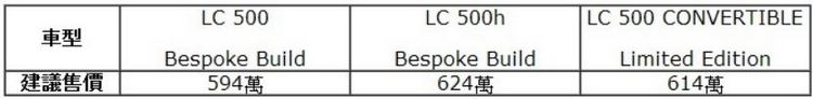 而動力方面則維持過去設定,LC 500與LC 500 CONVERTIBLE搭載5.0升V8自然進氣引擎,配備可變排氣閥門系統,擁有高達464 PS最大馬力及迷人的加速聲浪。LC 500h則採用3.5升V6油電複合動力與世界首創Multi-stage Hybrid多段式變速系統,創造出最大綜效馬力359 PS,讓油電複合動力車型也具備運動化的操駕感受。