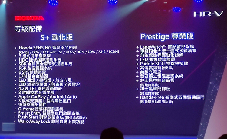 新 HR-V導入Honda SENSINGTM智慧安全輔助防護系統等高達29項主被動安全系統,其中LCDN前車駛離提醒系統為台灣首次導入,多功能安全配備還包含LaneWatchTM盲點監視系統(Prestige),承襲了Honda獨創G-CON技術與ACE鋼骨結構車體先進相容工程結構,通過廣面吸收、高效率的吸收衝擊能量,造就難以匹敵的車體結構;在車體前端採用衝擊緩和的構造,善盡保護行人安全的責任,體現Honda對「提昇自我保護能力」、「減低對方車輛的傷害」、「減低對路人的傷害」的努力,實現最完整的安全防護以及全方位對人友善的安全設計理念,達到2050年「品牌車款0死亡事故」的願景。 新世代動力系統引擎,搭配SUV專用進化版變速箱, 新 HR-V在動力編成上,以1.5L i-VTEC引擎為單一動力,最大馬力121ps/6600rpm,並強化1,500~3,000rpm扭力輸出,最大扭力達14.8 kg-m (145Nm) / 4,300rpm,並降低變速箱終傳比進而放大輪下扭力,配合EOP電動油泵提升效率,讓引擎經常發揮最大扭力輸出;新世代動力系統能符合最新六期環保,平均油耗從原本的14.5(km/l)提升為17.0(km/l),提供駕駛豐沛且流暢的駕駛體驗及節能油耗。至於不少人關心的e:HEV油電動力一如預料並未隨同上市,可能要等到之後改款才有機會與國內消費者見面。