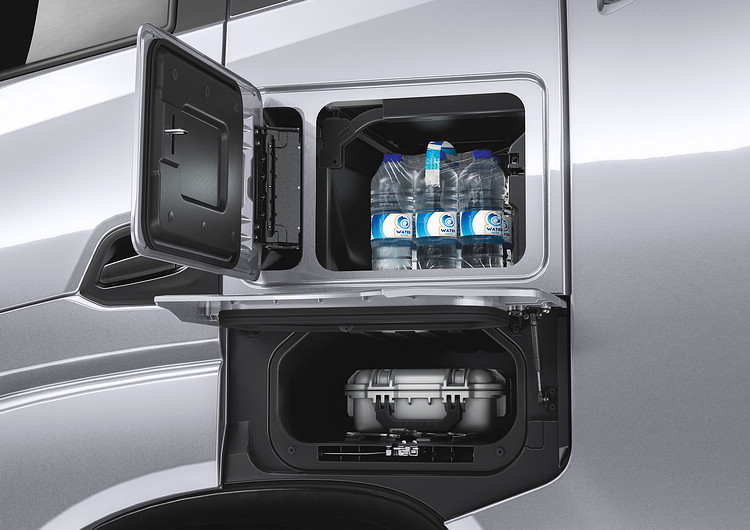 收納空間也相當多元而貼心,其中包括250公升層板、100公升冷藏櫃及冷凍櫃組合、手套箱附帶1.5升瓶架、以及高達380公升超大儲物容量的車外置物空間,都是標準配備。