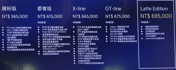 由於除了以上增加的配備,原本GT-Line的各項配備都加以保留,其中包括:GT-Line內外套件、電動前景天窗、光感應自動啟閉投射式燈組與四點式的LED日行燈、D-Cut跑格化方向盤、皮質排檔桿、懸浮式8吋多媒體影音觸控系統、自動恆溫空調系統等,不少皆是同級距罕見的配備,讓它成為入門小型車中配備最豐富的車款。