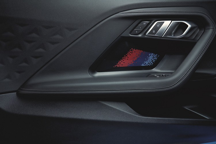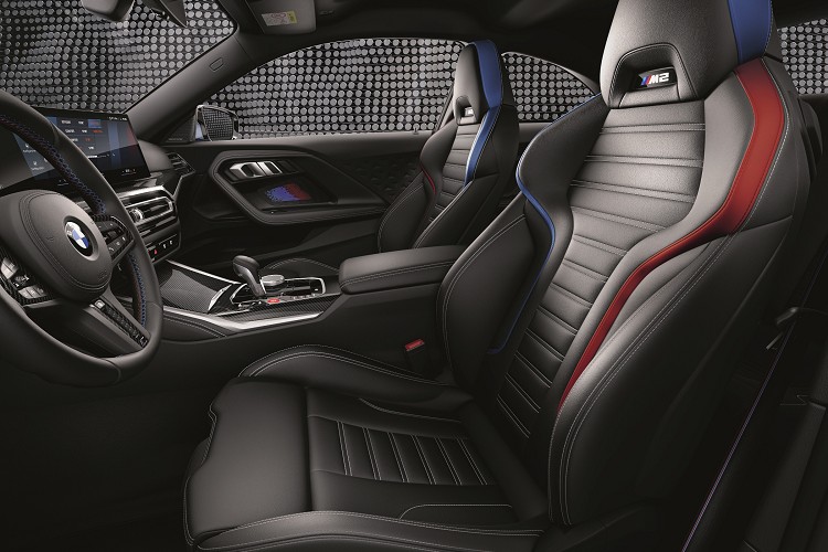 經典的駕駛導向設計搭配大量的M專屬風格,包含M專屬紅色引擎啟閉鈕、M多功能真皮方向盤搭配專屬縫線、M縫線安全帶以及絢麗奪目的M光影車門飾板等,為全新世代BMW M2打造出極具熱血氛圍的車室空間;首次出現在BMW車款中,以M品牌三色識別色彩包圍的Vernasca真皮M雙前座跑車座椅,以黑色皮革對襯鮮明的藍、紫、紅色彩,點綴發光的M2車型銘牌標誌,是此次全新世代BMW M2的內裝重點之一,後座採用40/20/40分離可傾倒後座椅背,讓空間更能靈活運用。另車主也可選用Merino真皮M碳纖維賽車桶型座椅,除可為車輛減少10.8公斤的重量,更完美地符合駕駛在賽道上極需的支撐與包覆性。