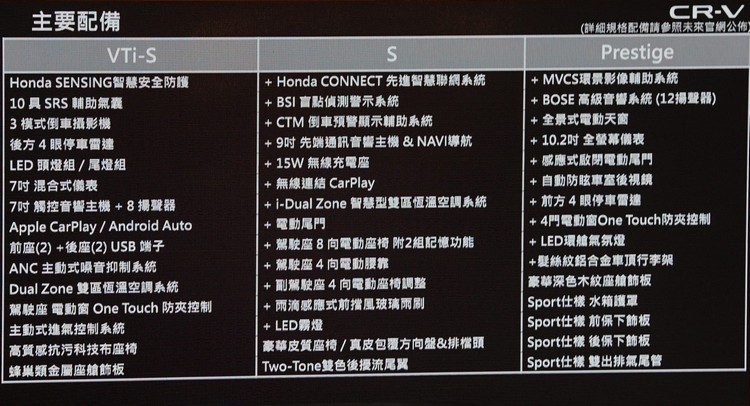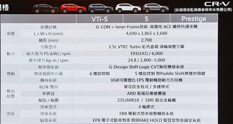 HONDA六代CR-V發表在即,台灣本田也先於今日對媒體舉行預賞會並於會中公布預售價(前1000位交車車主另享有專屬CR-V交車禮)。六代CR-V車系編成從上到下分為「Prestige」、「S」與「VTi-S」三個車型。車身尺碼較前代略為放大,車長:4690mm、車寬:1865mm、軸距:2700mm。車頭以大型水箱罩搭配銳利LED頭燈,車側線條例落方正,有助提高空力表現。車側則有雙色後擾流尾翼搭配高識別度LED尾燈。而在將車柱後移及將車側後視鏡移到車門上之後,駕駛視野也更為開闊。