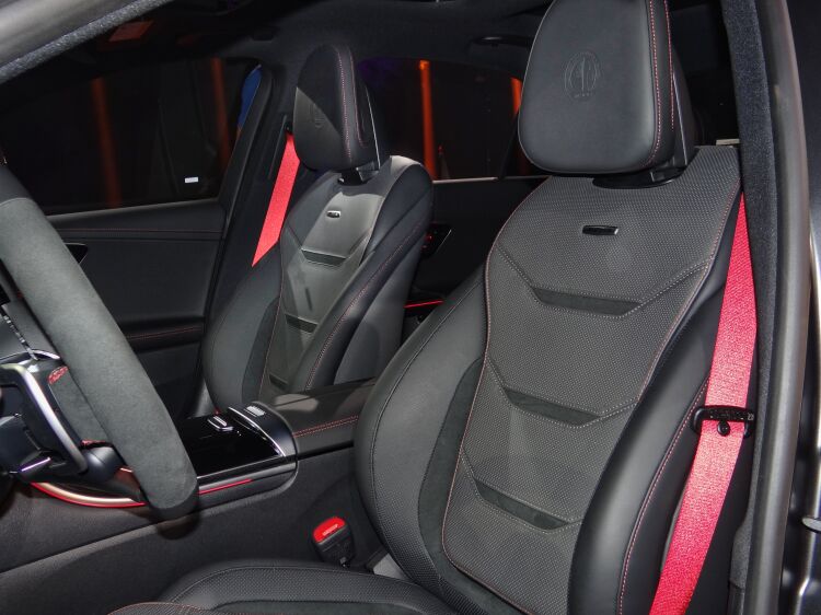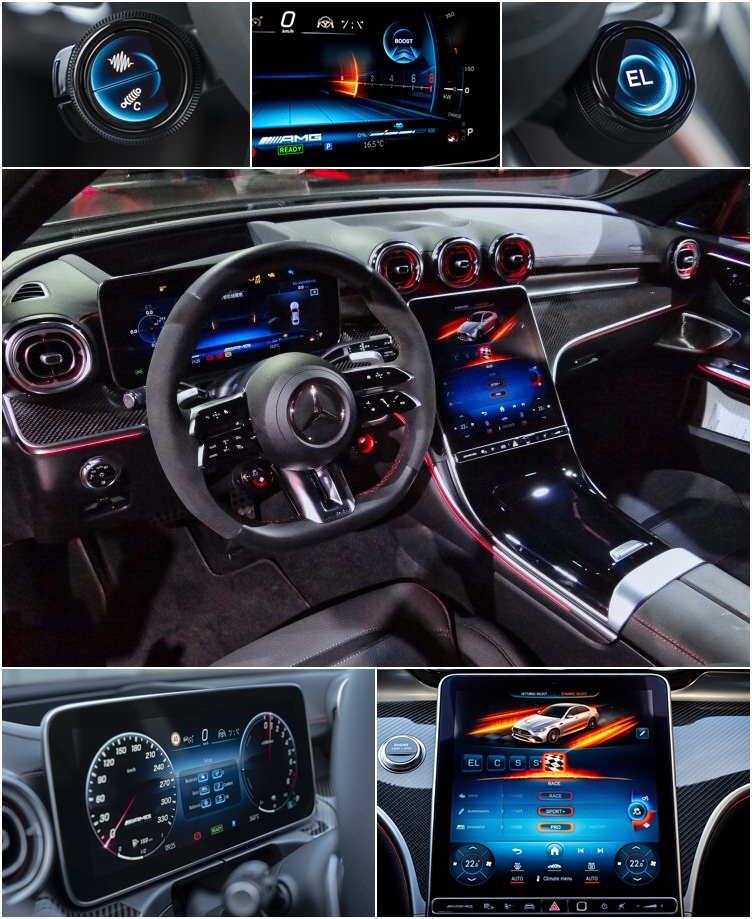 座艙持續展現戰鬥氛圍,跑車座椅頭枕壓印AMG 廠徽,MBUX 多媒體系統則納入先進科技及豪華功能,並提供Burmester環場音響與15具揚聲器。數位儀表板具備AMG 熱血氛圍的 Supersport 顯示風格,可顯示原廠導航系統與各種車輛資訊;抬頭顯示器則有 Race、Supersport 兩個專屬模式,透過強烈的戰鬥氛圍,提供動力系統功率、引擎轉速、馬力、扭力以及各項指標。