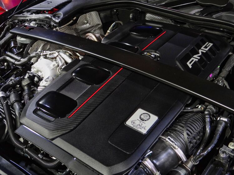 內裝以黑色和紅色對比呈現極速運動氛圍,採用黑色 Nappa 皮革座椅,紅色裝飾性縫線及紅色安全帶,並提供 AMG F1 Edition 碳纖維飾板以及 AMG 專屬腳踏墊,盡顯賽道魅力的專屬坐駕。