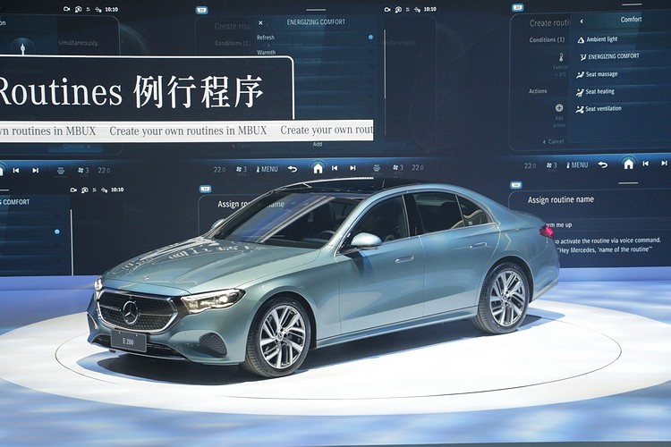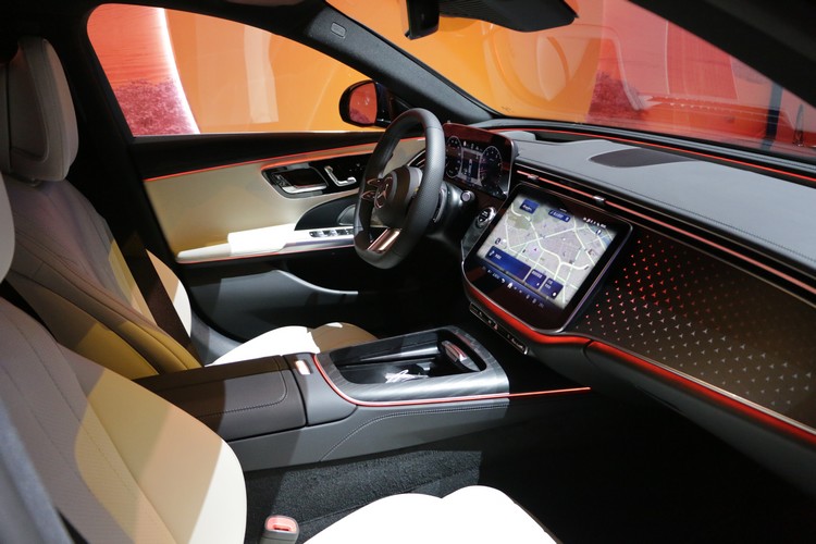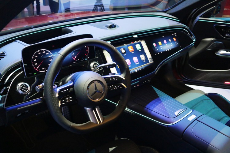 寬幅螢幕是內裝最大亮點,從中控台延伸至副駕駛座前方的超大觸控玻璃螢幕,搭配貫穿冷氣出風口造型的全景式內裝照明燈條,強化整體座艙科技氛圍。同時,車內採用大量懸浮式設計語彙,包含駕駛前方的數位儀表板、中控螢幕與車門把手、座椅功能控制面板,並提供多種飾板材質與皮質搭配,並有不同配色。全新 E-Class並新增數位鑰匙功能,首次綁定後,只需攜帶 iPhone 或 Apple Watch 即可解鎖、上鎖或啟動車輛。