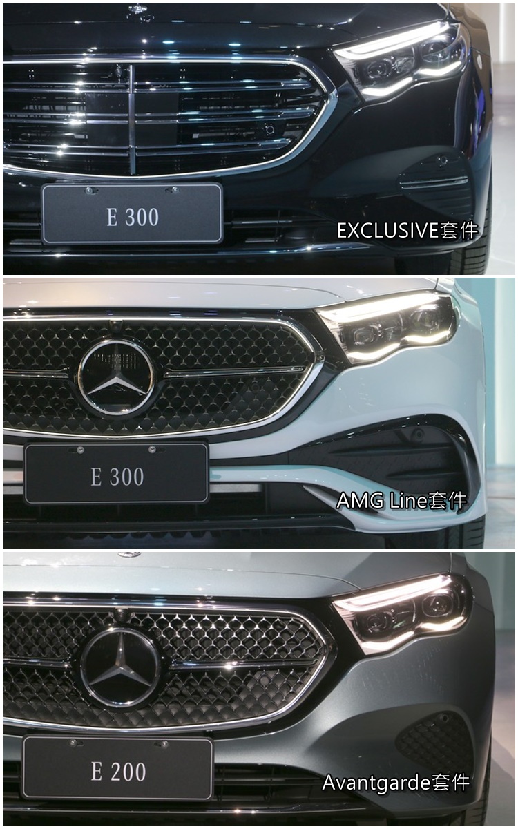 全新E-Class提供三種不同外觀套件選擇,其中,E200 LUXURY標配Avantgarde套件、E300 運動版標配AMG Line 套件,E300 EXCLUSIVE則是搭配經典三芒星立標 EXCLUSIVE 套件,旅行車E200 Estate同樣標配 AMG Line 套件。