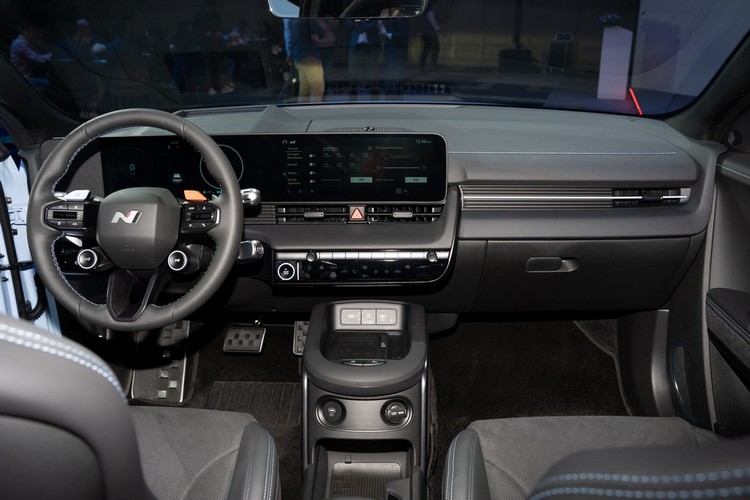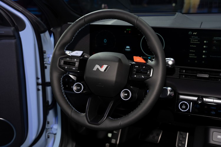 以駕駛者為中心的車艙第一視覺,IONIQ 5 N大幅強化內裝佈局,換上專屬N性能多功能方向盤,快速切換駕駛模式,亦能直接啟動N超增壓模式 (N Grin Boost) 與N換檔回饋 (N e-Shift) 。同時,設計風格與抓握感針對性能操控需要升級,配合N Performance品牌LOGO與對比色縫線點綴,視覺、觸感以及極限操作同步強化。車艙內採用黑色頂篷,配合對比色縫線與方格旗元素,凸顯IONIQ 5 N源自於賽道的冠軍DNA戰鬥氣息,甚至腳下方格旗小巧思的N專屬性能金屬踏板組,藉以細節營造性能視覺。