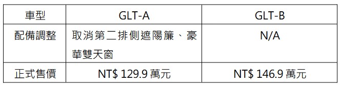 HYUNDAI總經銷南陽實業宣布Custin車型配備及售價調整,現行販售GLT-A因應市場消費者反饋,將入門款售價調整至更親民的130萬元內,未來將取消第二排側遮陽簾及豪華雙天窗兩項配備,正式售價反映規格配備調整,GLT-A為129.9萬元,原GLT-B款則維持不變。南陽實業表示,針對3月31日前下訂之原A款車主則不受此調整影響,將以原車型交付。