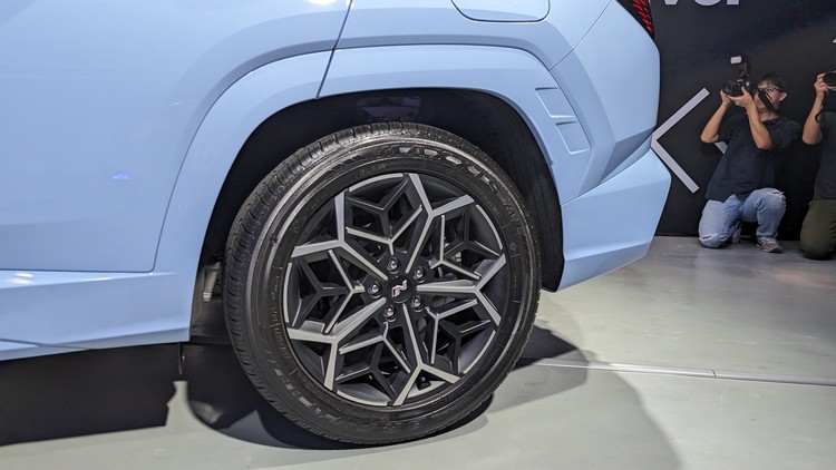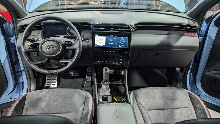 外觀上,水箱罩旁的飛翼日行燈透過幾何造型調整為整車增添了動感,並有專屬於N Line的銘板高掛其中;加上矩形空氣力學前保桿和黑鉻幾何水箱護罩/下氣壩,細節設計也突顯了車輛的運動氛圍,腳上則是配19吋性能跑格鋁圈。車尾採用了空氣力學尾翼及空氣力學分流後保桿,行駛更加穩定;雙出金屬尾管的設計不僅提升了排氣效能更讓整個車尾看起來更加俐落;前葉子鈑N Line徽飾增添了一份獨特的品味;車色上則有N-Line專屬的性能藍。