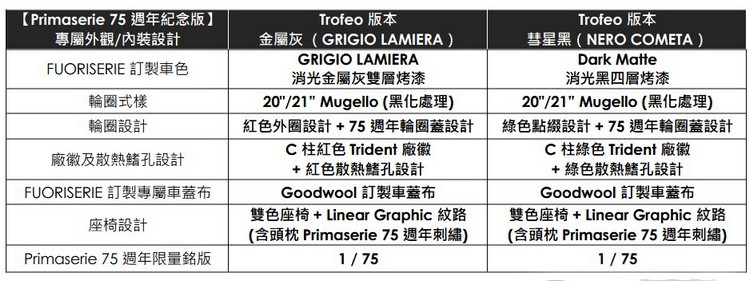 限量版外觀配備前 20 吋、後 21 吋的 Mugello 黑化輪圈,將引人注目的 75 週年標誌置於輪圈中央,而車室內的 4 座頭枕則以 75 週年標誌的專屬刺繡進行點綴,搭配雙色 Linear Graphic 紋路的座椅內裝,精湛工藝之下的細緻鋪陳,為義式奢華做出了最佳詮釋。